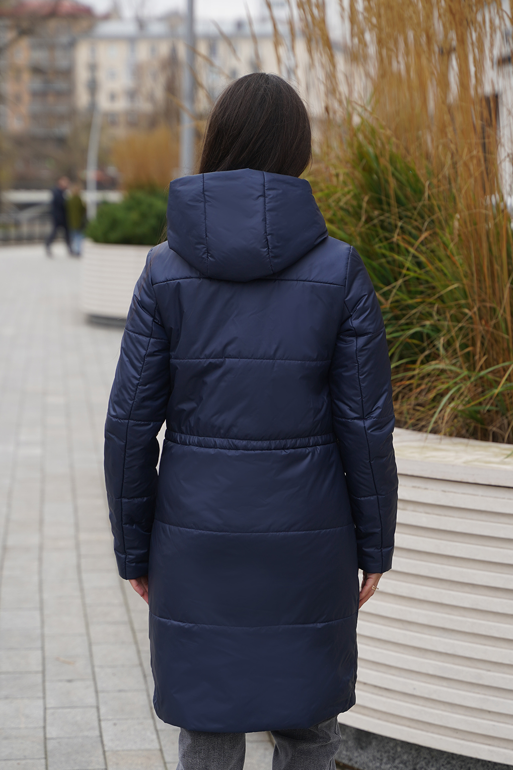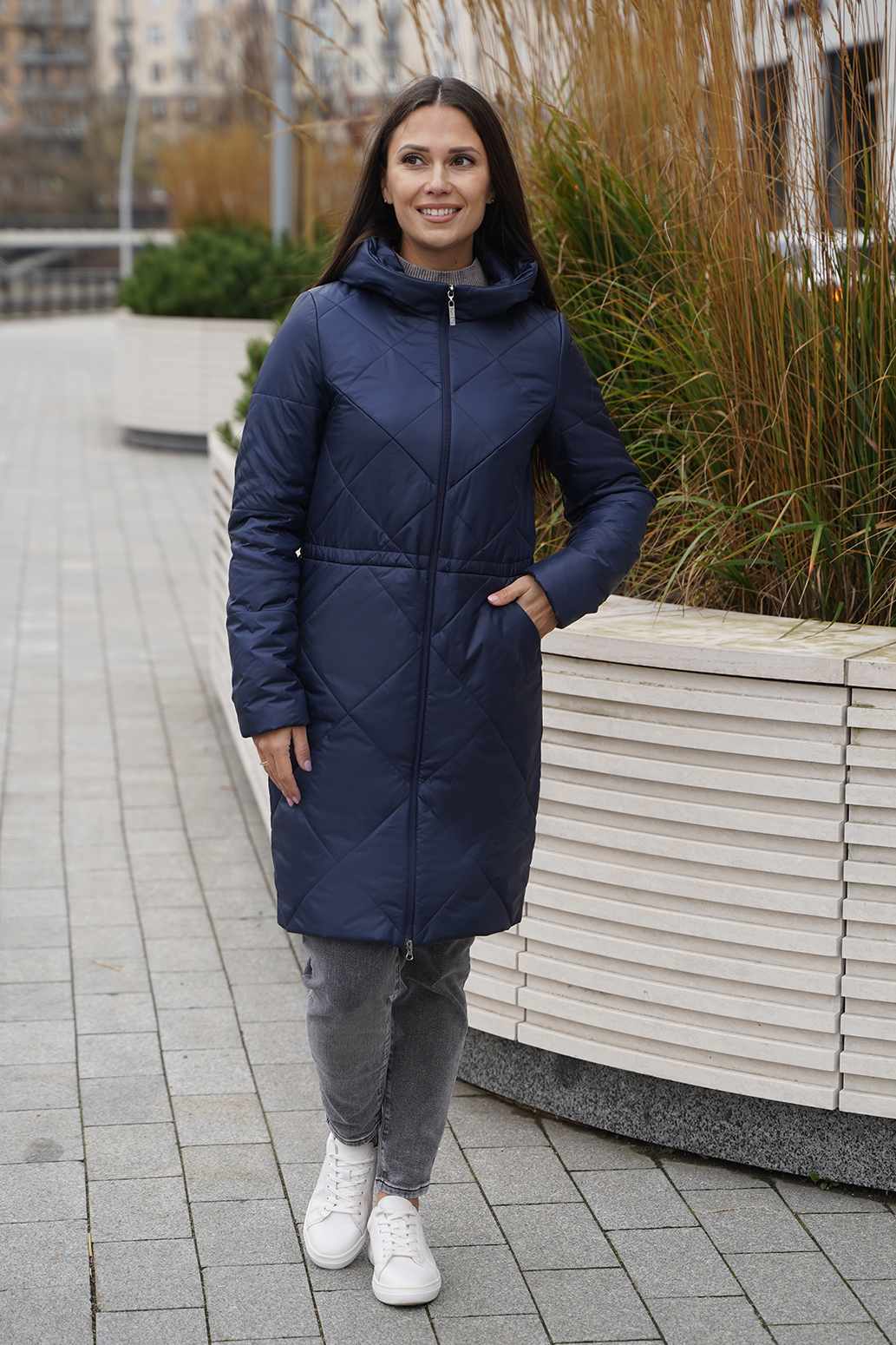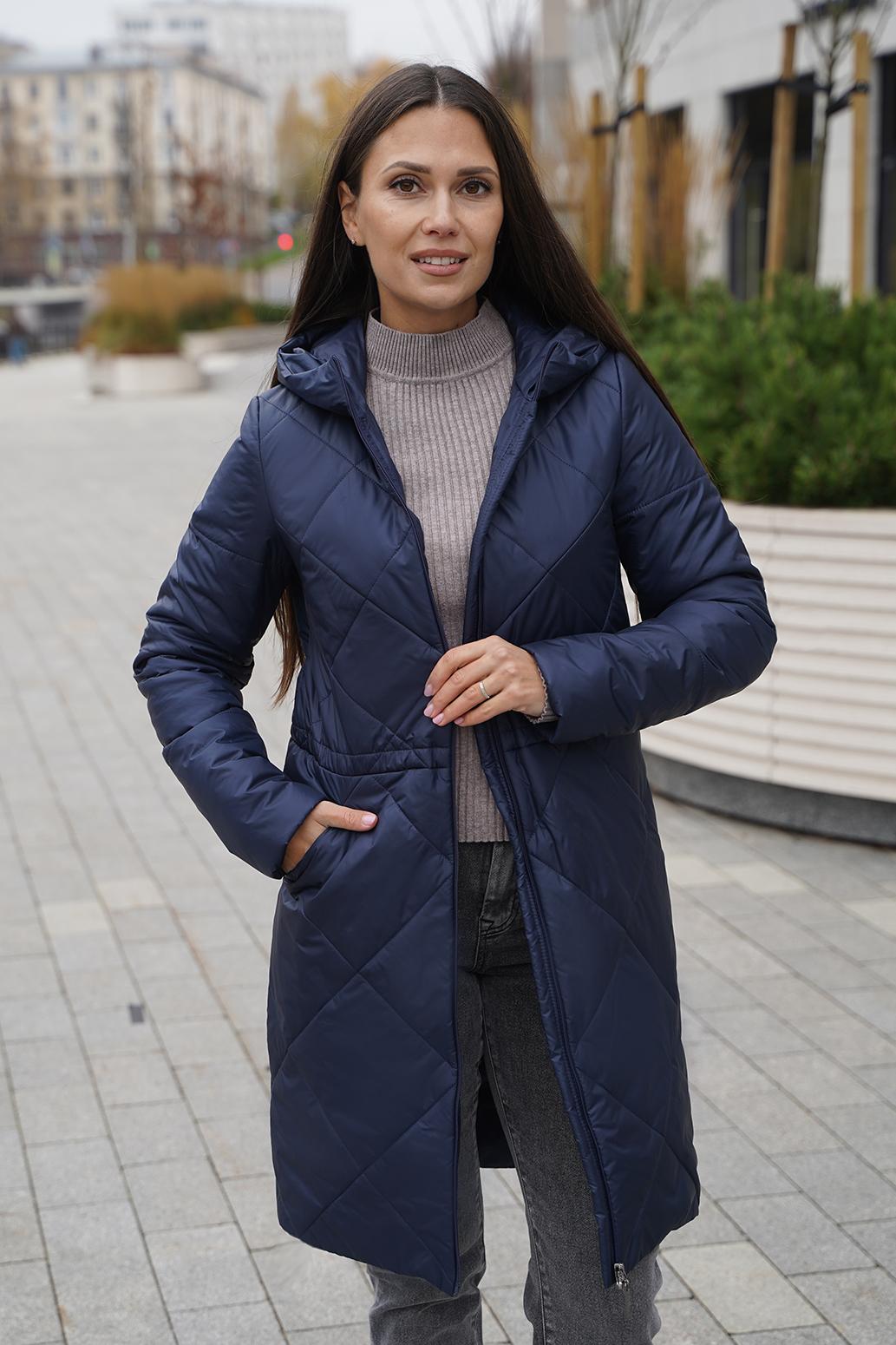 Стильное пальто прямого силуэта с застежкой на молнию и ромбовидной стежкой,рукав втачной,карманы расположены в стежке переда.Линию талии подчеркивает регулируемая кулиса.