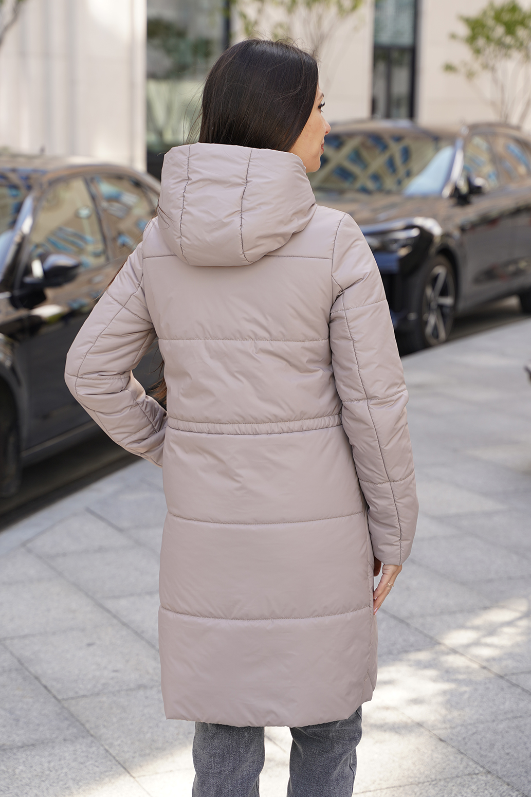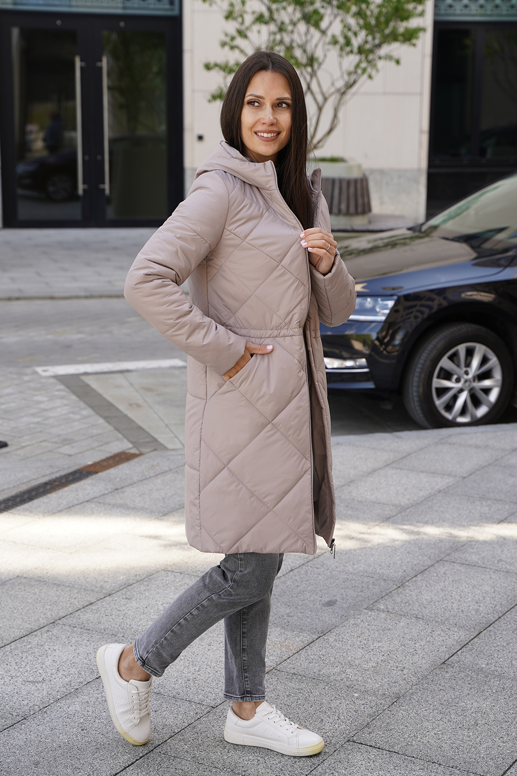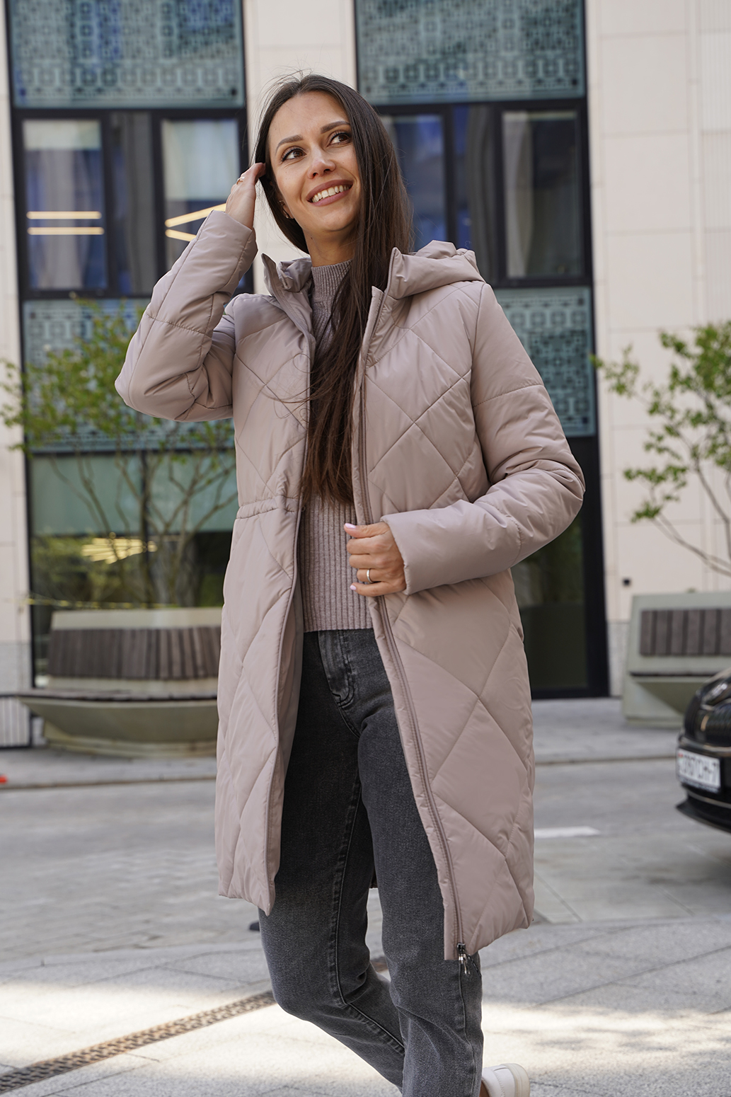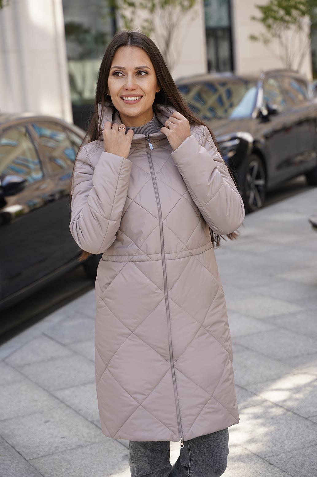 Стильное пальто прямого силуэта с застежкой на молнию и ромбовидной стежкой,рукав втачной,карманы расположены в стежке переда.Линию талии подчеркивает регулируемая кулиса.