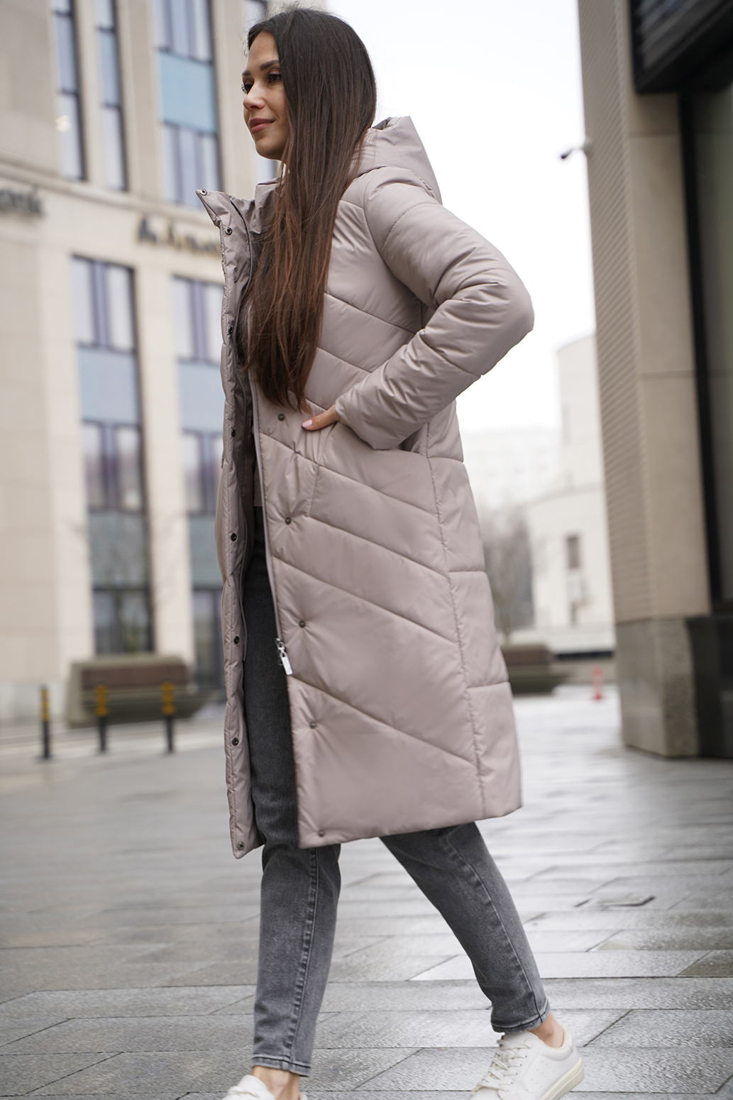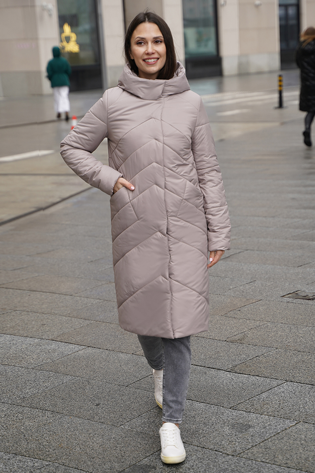 Женское удлиненное пальто на синтепоне полуприлегающего силуэта, отличный выбор для холодного времени года. Пальто с капюшоном со стойкой обеспечивает дополнительную защиту от ветра и холода, а оригинальная стежка придает изделию стильный и современный вид. Прорезные карманы не только удобны, но и добавляют функциональности. Такое пальто можно сочетать с различными нарядами: от джинсов и свитеров до более строгих комплектов с платьями или юбками. Оно отлично подойдет как для повседневной носки, так и для более формальных случаев.