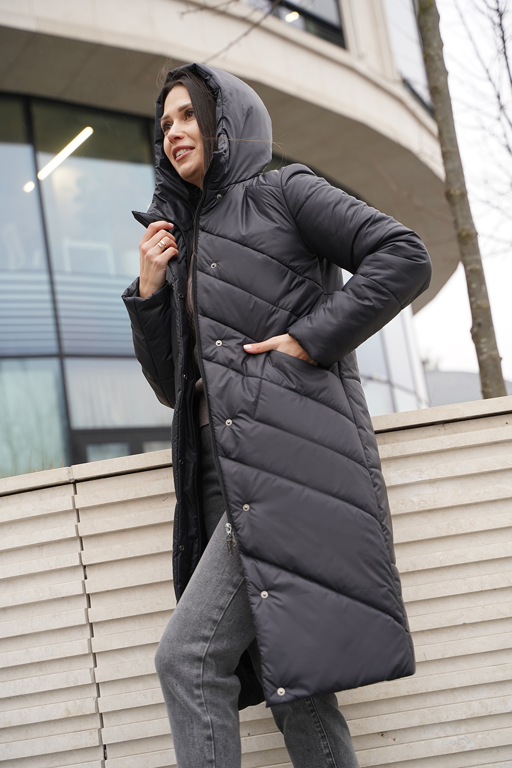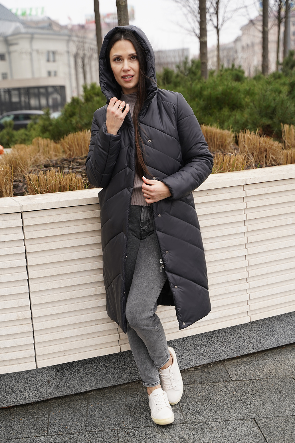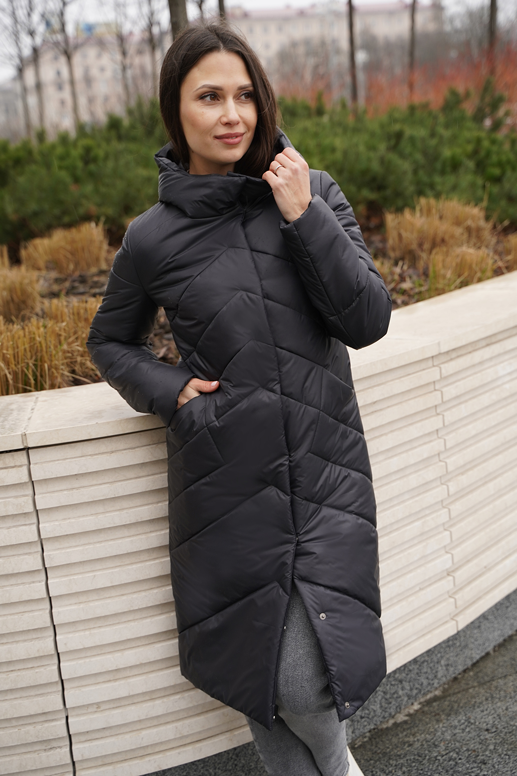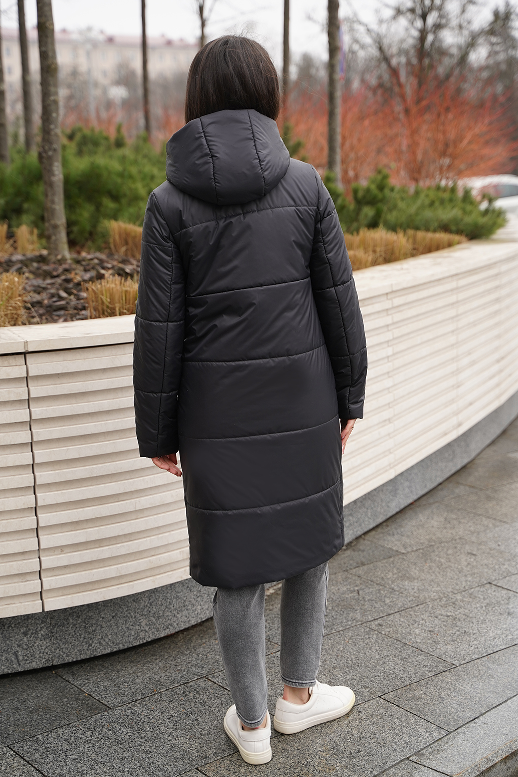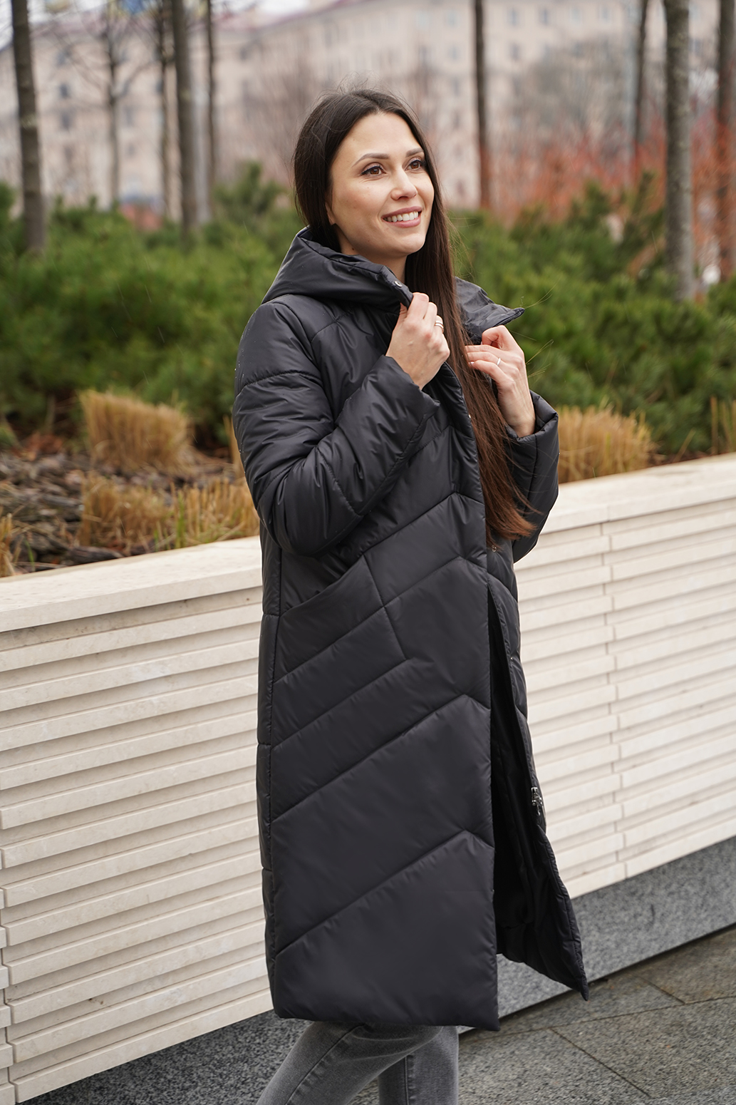 Женское удлиненное пальто на синтепоне полуприлегающего силуэта, отличный выбор для холодного времени года. Пальто с капюшоном со стойкой обеспечивает дополнительную защиту от ветра и холода, а оригинальная стежка придает изделию стильный и современный вид. Прорезные карманы не только удобны, но и добавляют функциональности. Такое пальто можно сочетать с различными нарядами: от джинсов и свитеров до более строгих комплектов с платьями или юбками. Оно отлично подойдет как для повседневной носки, так и для более формальных случаев.