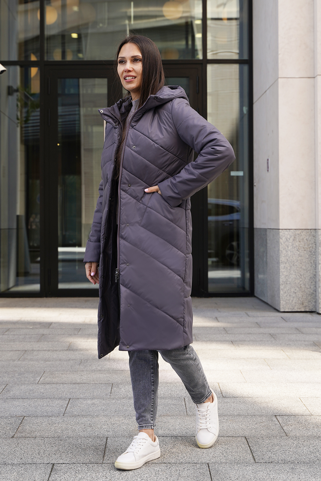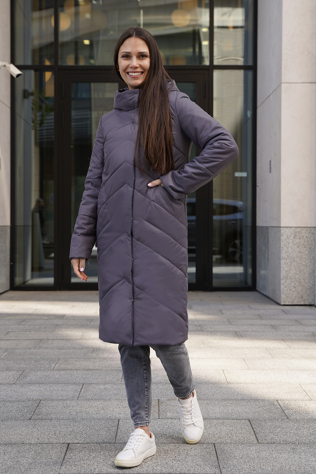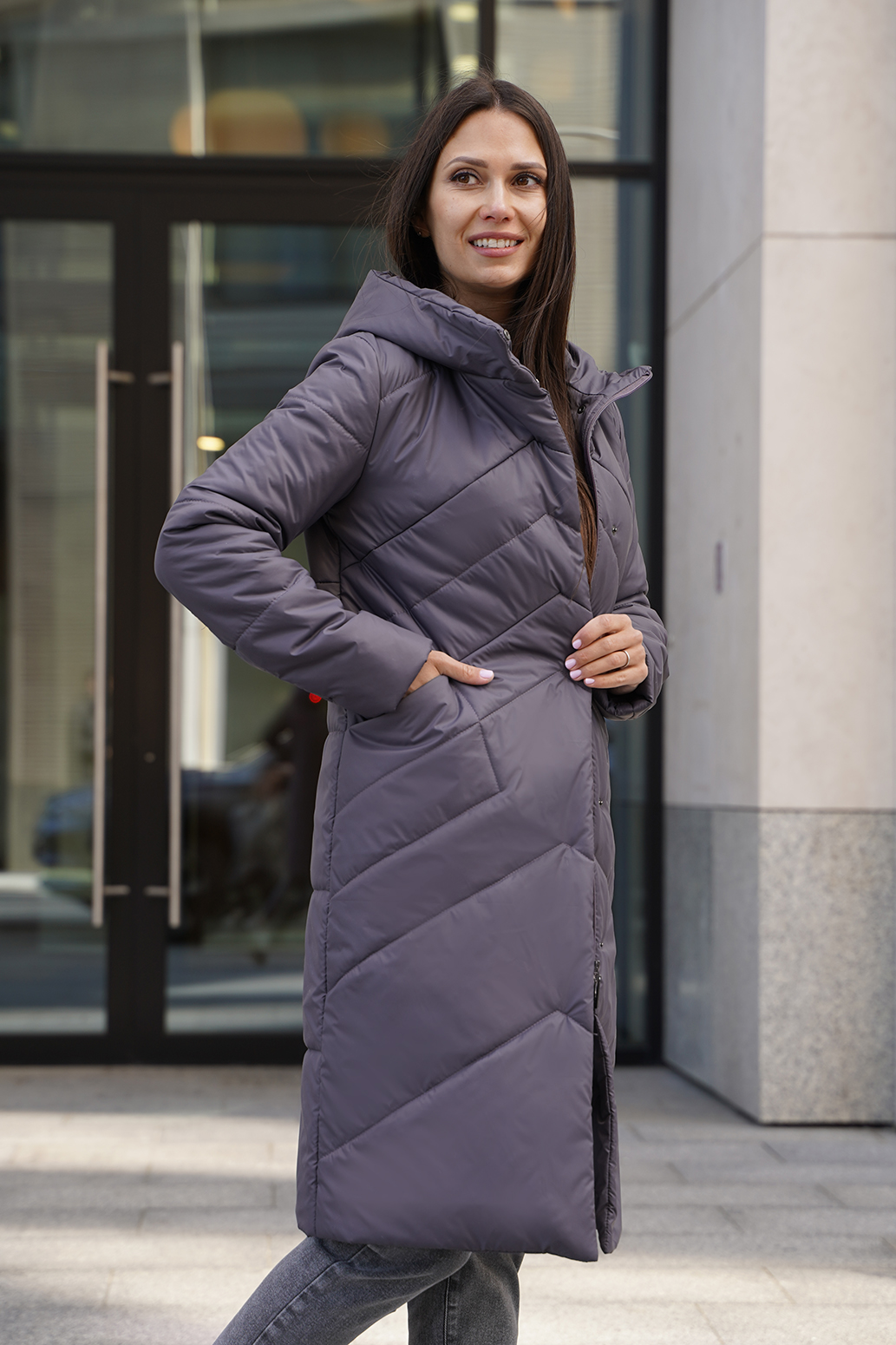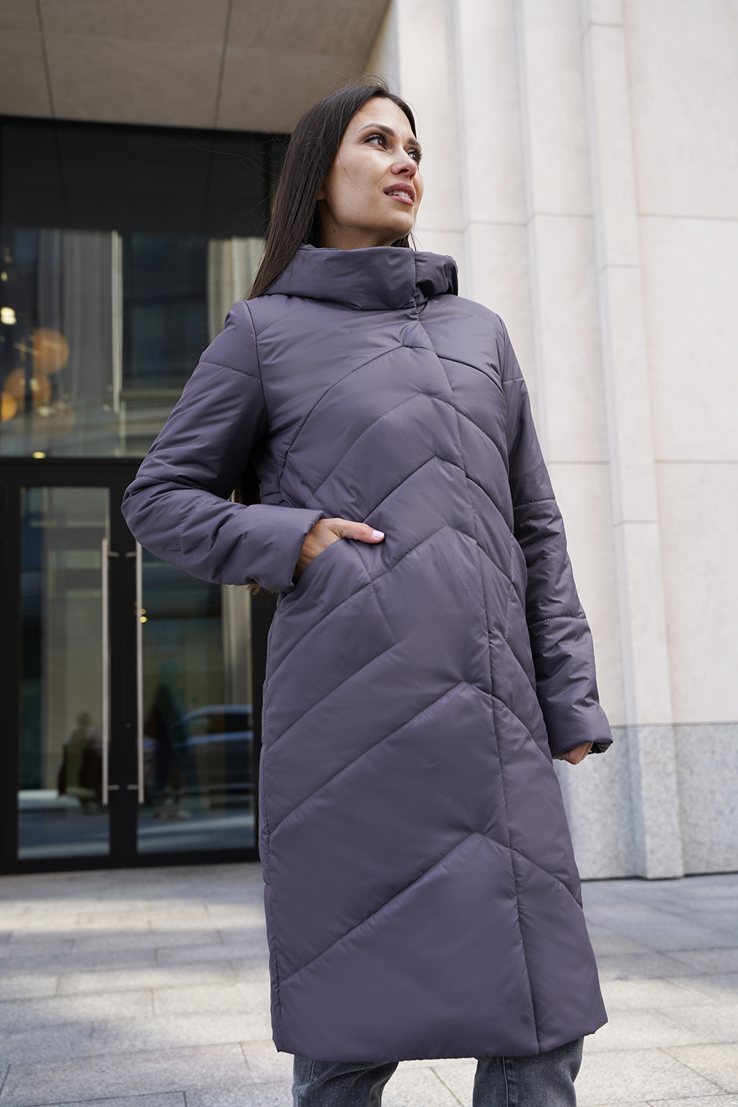 Женское удлиненное пальто на синтепоне полуприлегающего силуэта, отличный выбор для холодного времени года. Пальто с капюшоном со стойкой обеспечивает дополнительную защиту от ветра и холода, а оригинальная стежка придает изделию стильный и современный вид. Прорезные карманы не только удобны, но и добавляют функциональности. Такое пальто можно сочетать с различными нарядами: от джинсов и свитеров до более строгих комплектов с платьями или юбками. Оно отлично подойдет как для повседневной носки, так и для более формальных случаев.